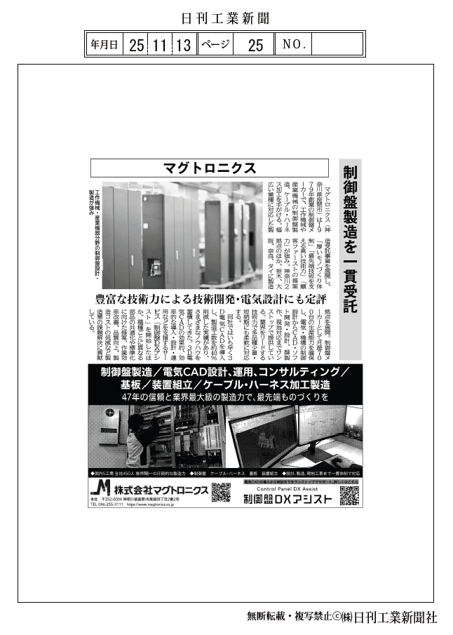 11月13日、日刊工業新聞「神奈川県央特集」で、弊社の特集記事が掲載されました。